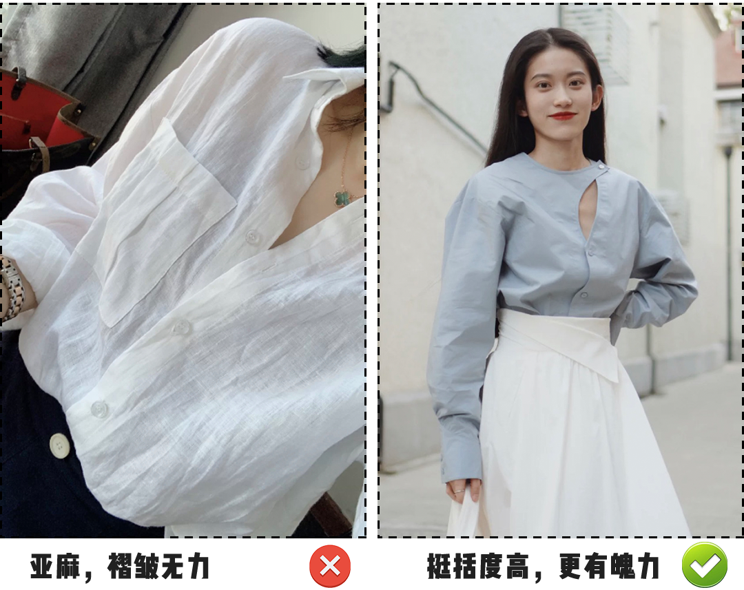 面料的挺阔度也是重点!!姐妹们都穿过容易皱的棉质或亚麻衬衣吧