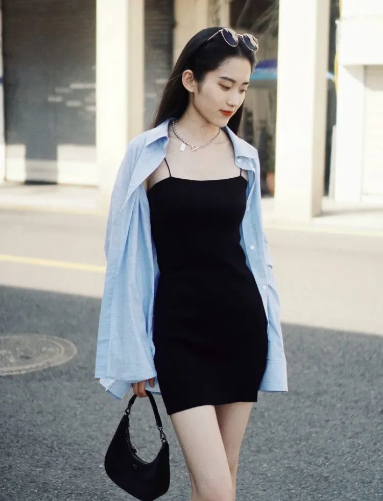 再比如港风中经常CUE到的小黑裙, 我看她就融合的很好, 搭配H版型衬衫就很有中性港风的味道