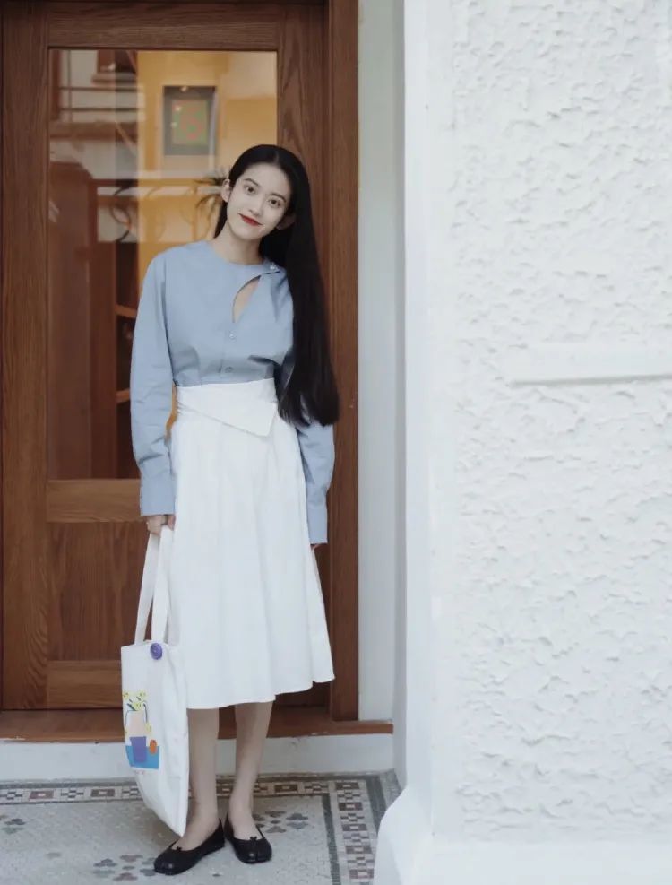 港风的衬衫 有点冷感法式感 线条利落,微微宽松的版型; 如果跟我一样已经囤了很多件白衬衫, 也可以参考博主Moe 选一些浅蓝色的