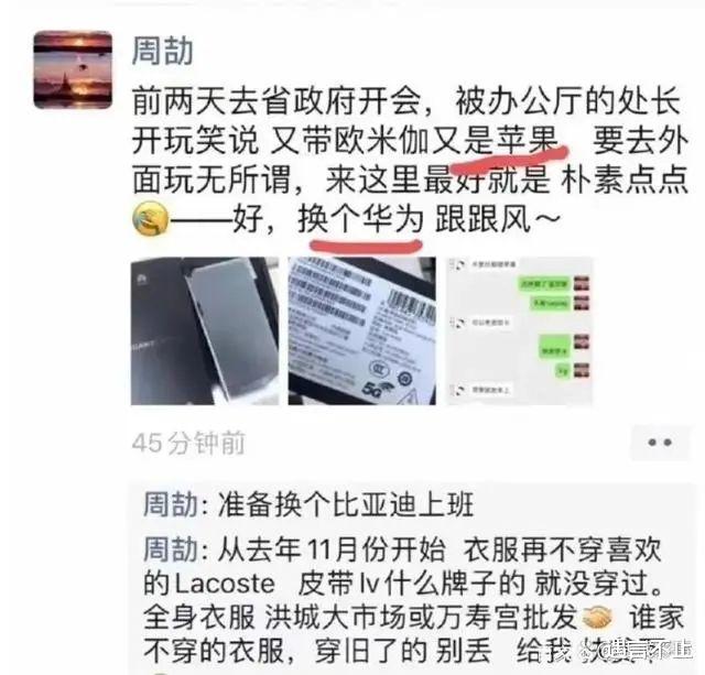 ▲懂得总结别人的策略,跟风低调用华为,穿批发市场衣服,但却不懂得在朋友圈避嫌