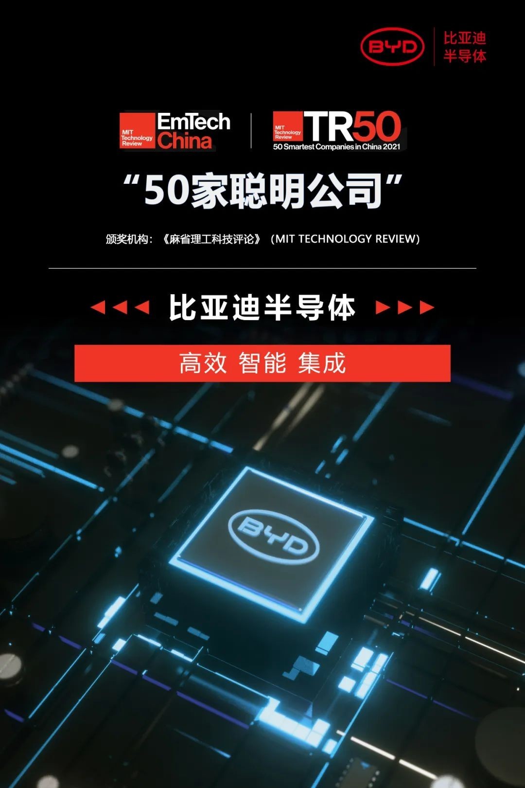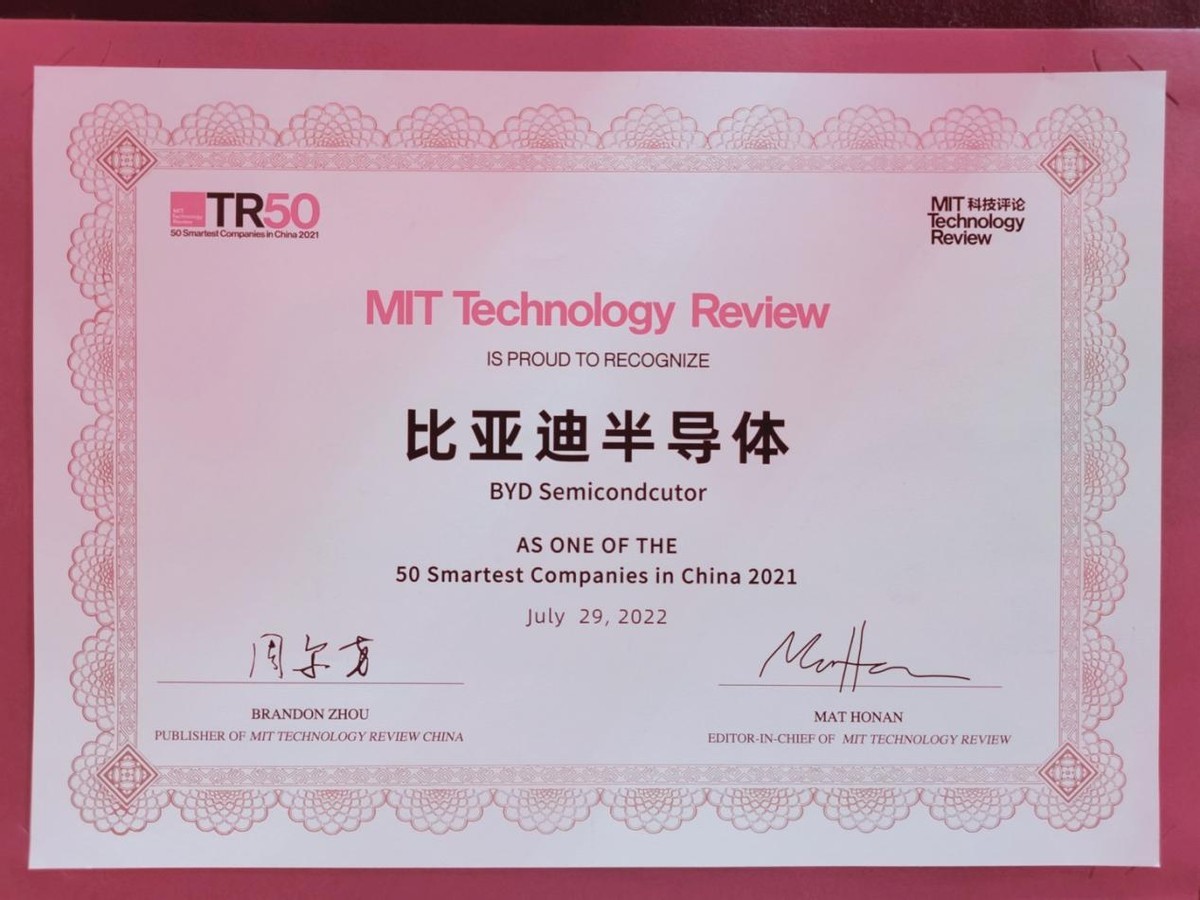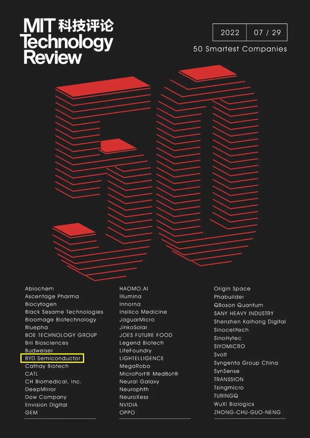 在 2022 年 7 月 29 日举办的 EmTech China 2022 全球新兴科技峰会上,国际权威科技媒体《麻省理工科技评论》隆重发布了企业排名重磅榜单——“50 家聪明公司”(MIT TR50)。比亚迪半导体以科技创新企业代表荣登榜单,获得全球范围的关注和认可。