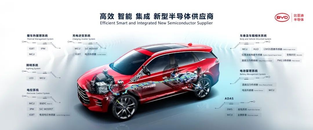 比亚迪半导体成立于2004年,历经十余载,依靠自主研发掌握了一系列核心技术,现已成长为国内领先的车规级半导体整体方案供应商,产品已基本覆盖新能源汽车核心应用领域。在功率半导体、智能控制 IC、智能传感器、光电半导体、晶圆制造与服务等领域深入布局,凭借持续的研发投入、经验丰富的研发团队和多年的技术积累及应用实践,比亚迪半导体形成了丰富的产品线,并在车规级产品领域实现了重大技术突破。
