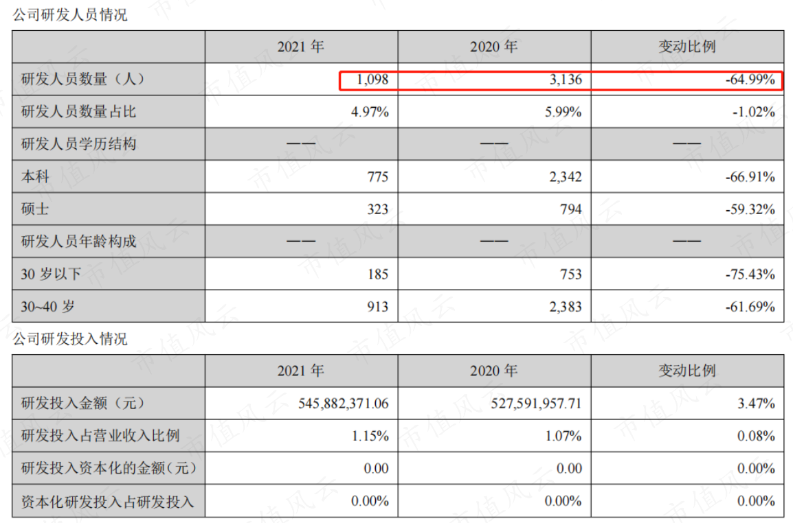 先是拿研发人员开刀。2021年公司的研发人员人数为1098人,较2020年砍去了三分之二。