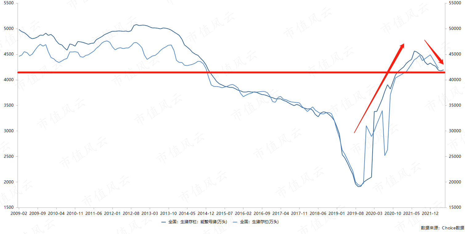 2021年6月以来,能繁母猪存栏量开始进入下降区间,生猪存栏量也从2021年12月开始下降,但目前的生猪存栏量仍不能说是位于了历史低位。