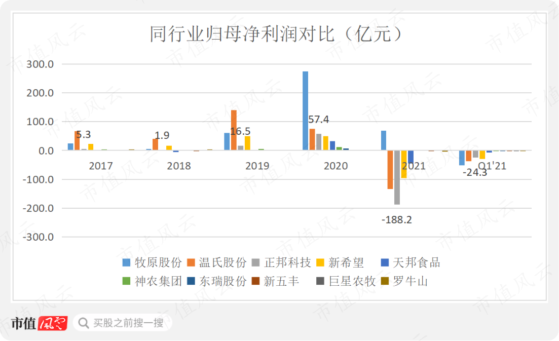 更惨的是,与牧原股份和$温氏股份(300498.SZ)$等大佬相比,公司2020年赚的没有人家多,2021年亏的却比人家多很多。