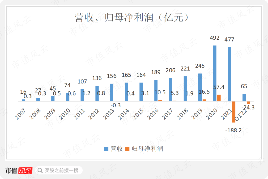 公司上市于2007年,2007-20年14年里,辛辛苦苦累计赚到的归母净利润为99亿,而2021年一年就亏掉了近2倍。可谓是一夜回到解放前的楷模。