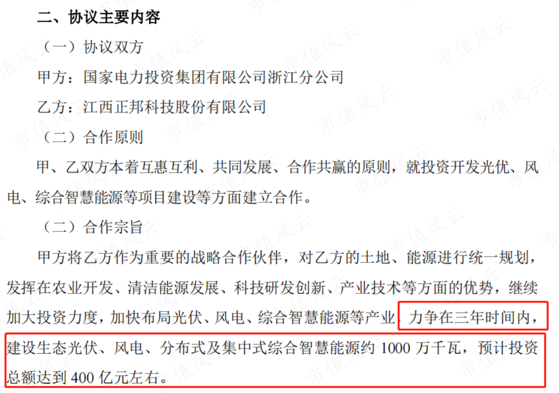 为了提振股价,6月18日,公司发布于与国家电投浙江分公司签署《“碳中和”综合智慧能源项目合作协议书》的公告,公告称三年内双方将合作建设光伏、风电等1000万千瓦,总投资达400亿。