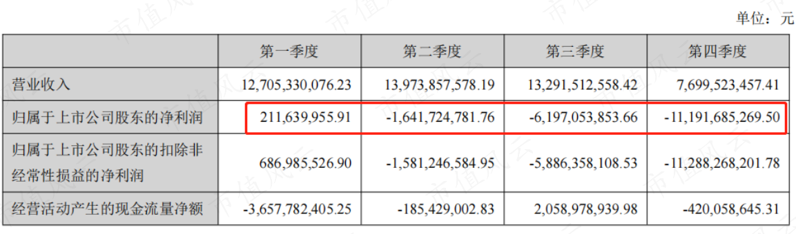 从分季度数据来看,公司2021年一季度微赚,2季度开始亏损,且亏损逐渐扩大,2-4季度归母净利润分别为-16.4亿、-62.0亿和-111.9亿。