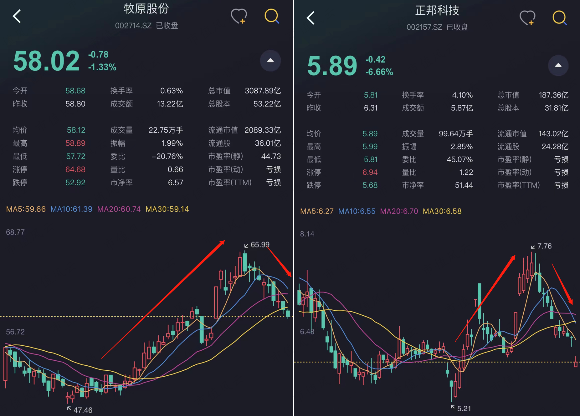 如牧原股份和正邦科技,在最近一波上涨中分别达到39%和49%,不过没有基本面支撑的股价怎么上去还是会怎么下来,近日也均有较大程度的回撤。