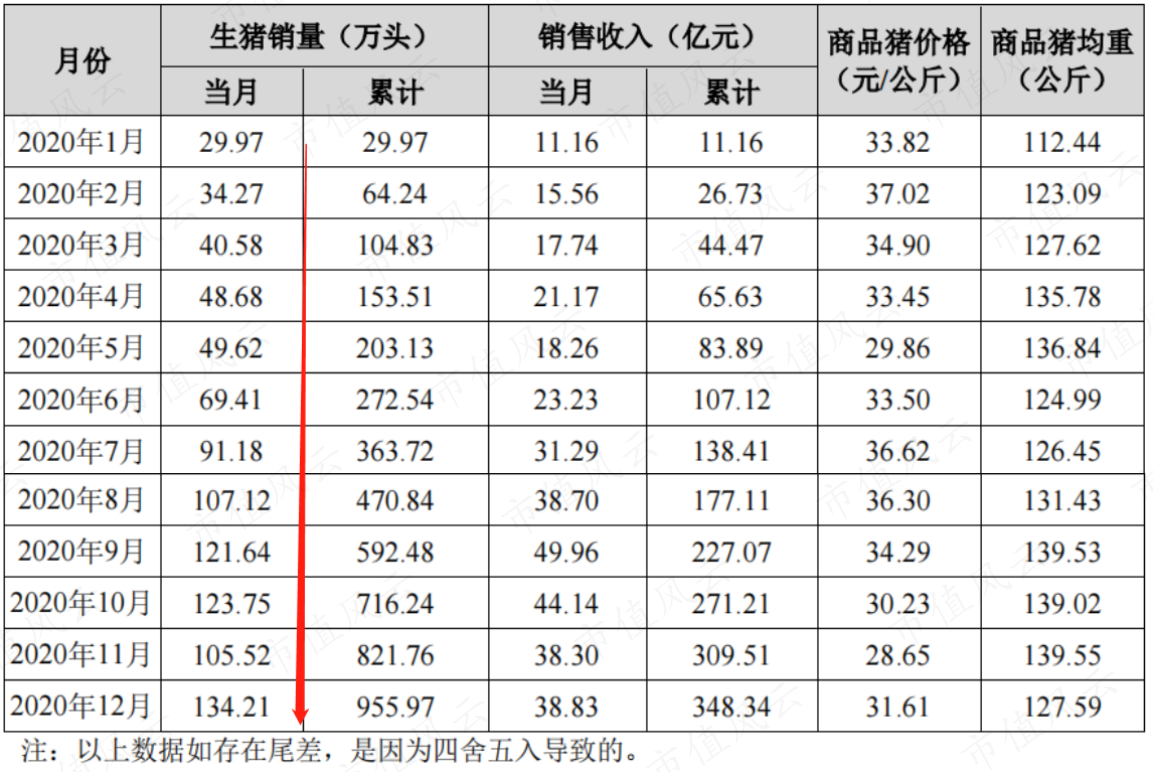 回顾2020年,公司每月生猪销量一路飞涨,从一月份的29.27万头生生涨到了12月份的134.21万头,全年猪价也基本都维持在30元/公斤的高价。