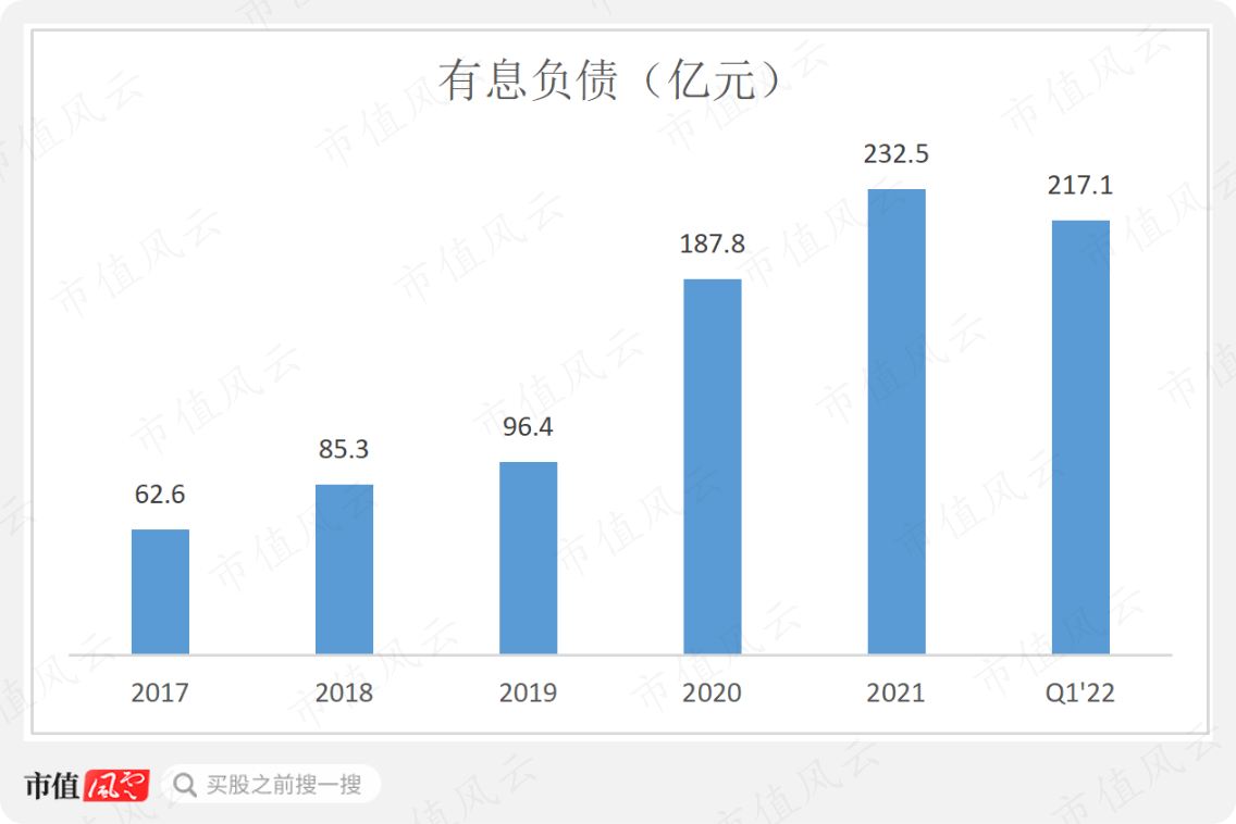 扩产能需要钱,公司更是进行大举有息借款,截至2022年一季度,公司有息负债金额达到217.1亿,是2018年末的2.5倍。