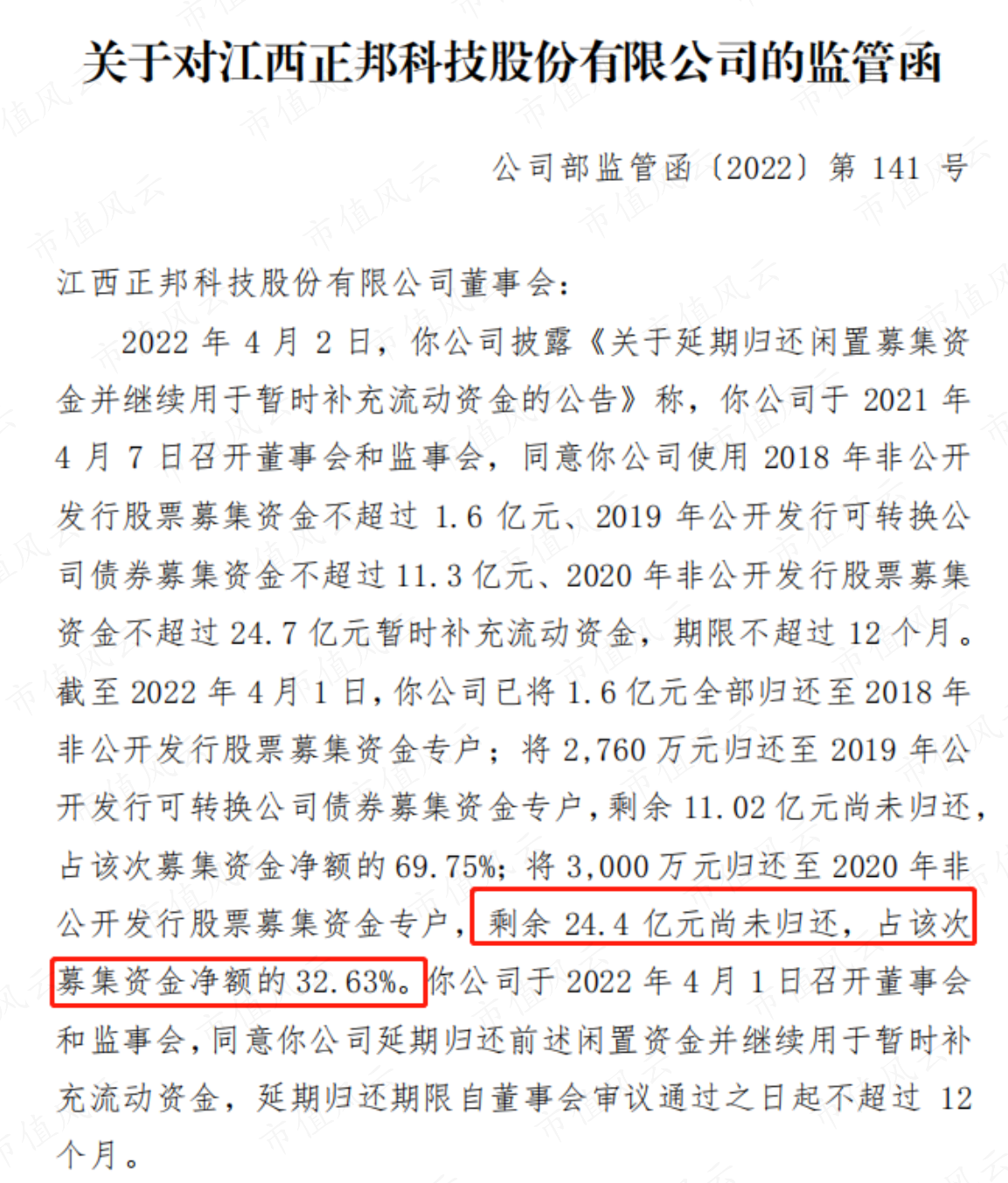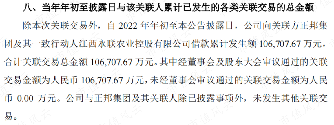 2022年以来,公司累计向正邦集团及江西永联借款累计发生额已达10.7亿。