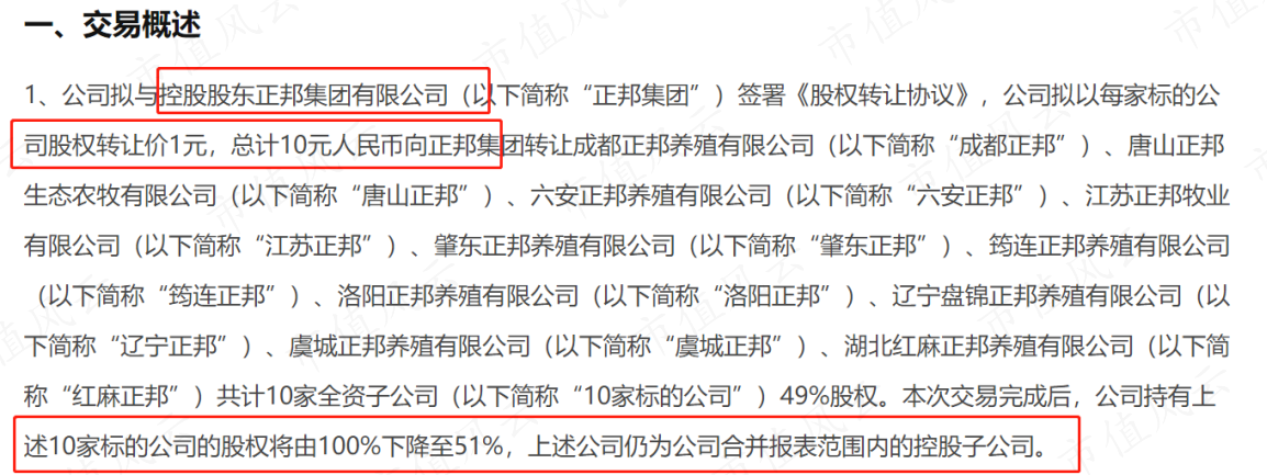 2022年7月2日,公司又将十家亏损得养猪子公司49%的股权卖给了控股股东正邦集团,总共作价10元,公司持有这10家公司的股权由100%下降至了51%,还属于合并报表范围内的控股子公司。