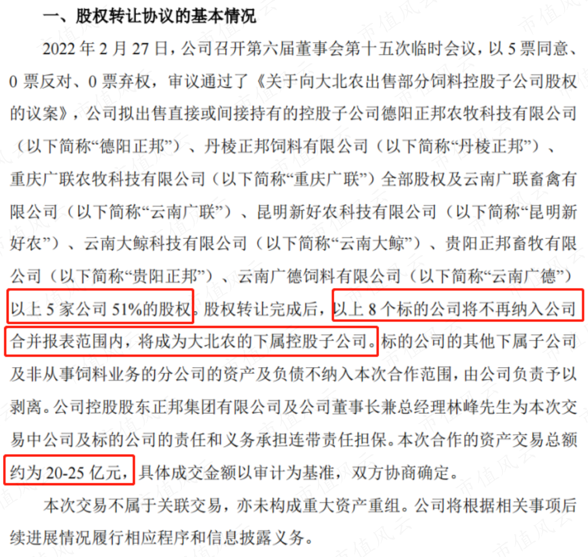 公司公告称,计划向$大北农(002385.SZ)$出售3家饲料公司100%股权以及5家饲料公司的51%股权,完成后以上8个标的公司将不再纳入公司合并报表。