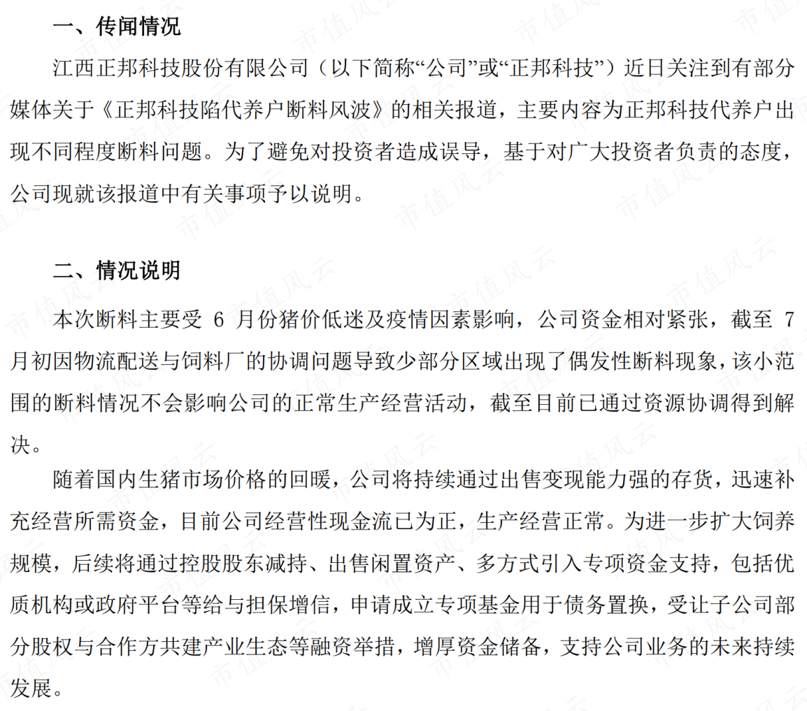 媒体报道内容则涉及正邦科技出现不同程度断料问题,公司回应称这是偶发性现象,主要是由于6月份猪价低迷及疫情等因素影响,公司资金相对短缺。