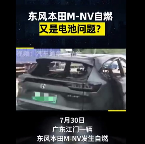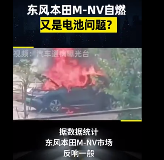 据相关媒体爆料,近日,广东江门一辆东风本田M-NV发生自燃,整体车身完全烧报废,起火部位疑似又是电池舱。据悉,该车自上市以来反响平平,六月销量1109辆,截止2022年累计销量仅为4121辆。