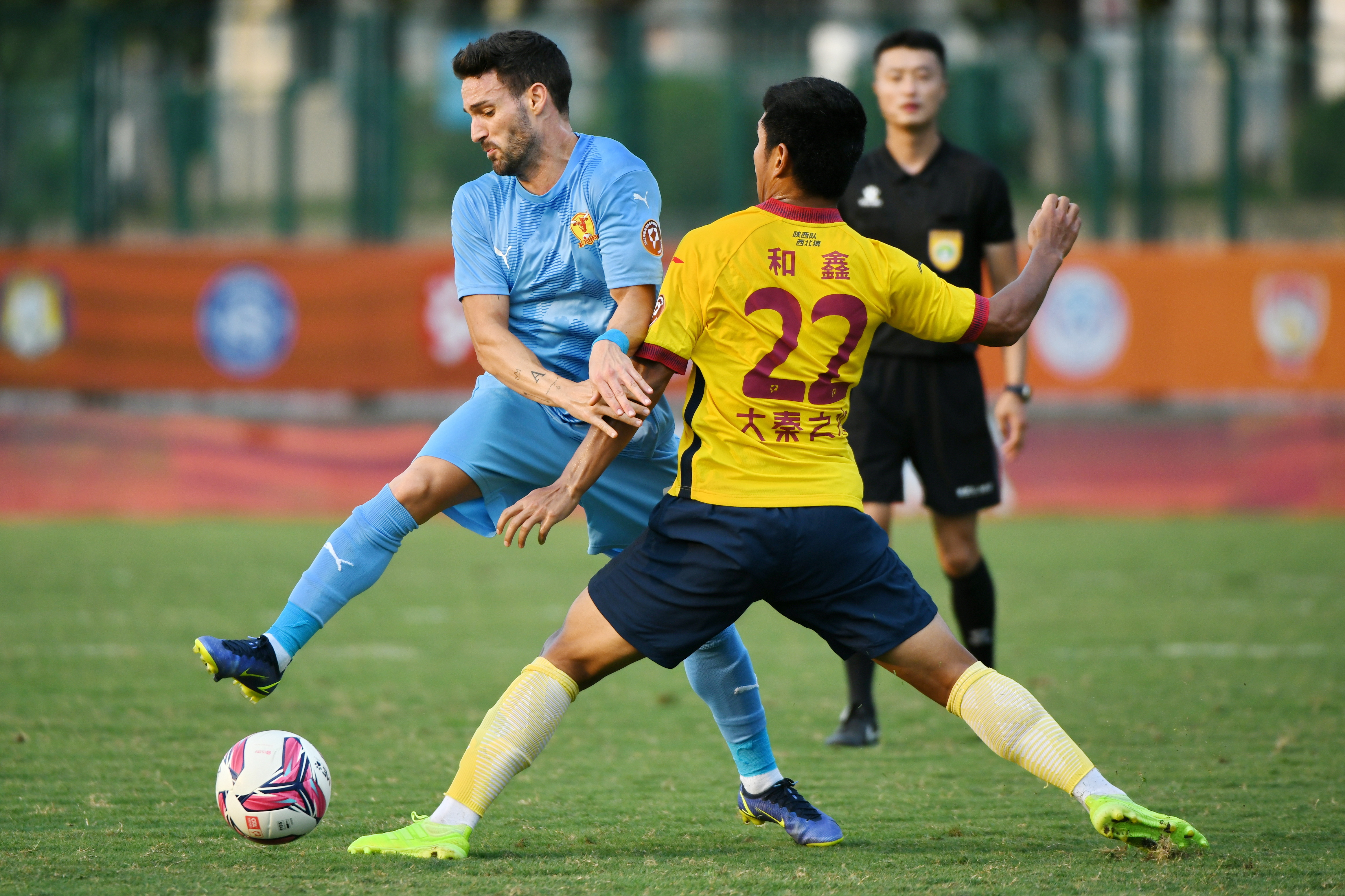 8月1日,陕西长安竞技队球员和鑫(右)在比赛中与四川九牛队球员奥尔蒂斯拼抢。