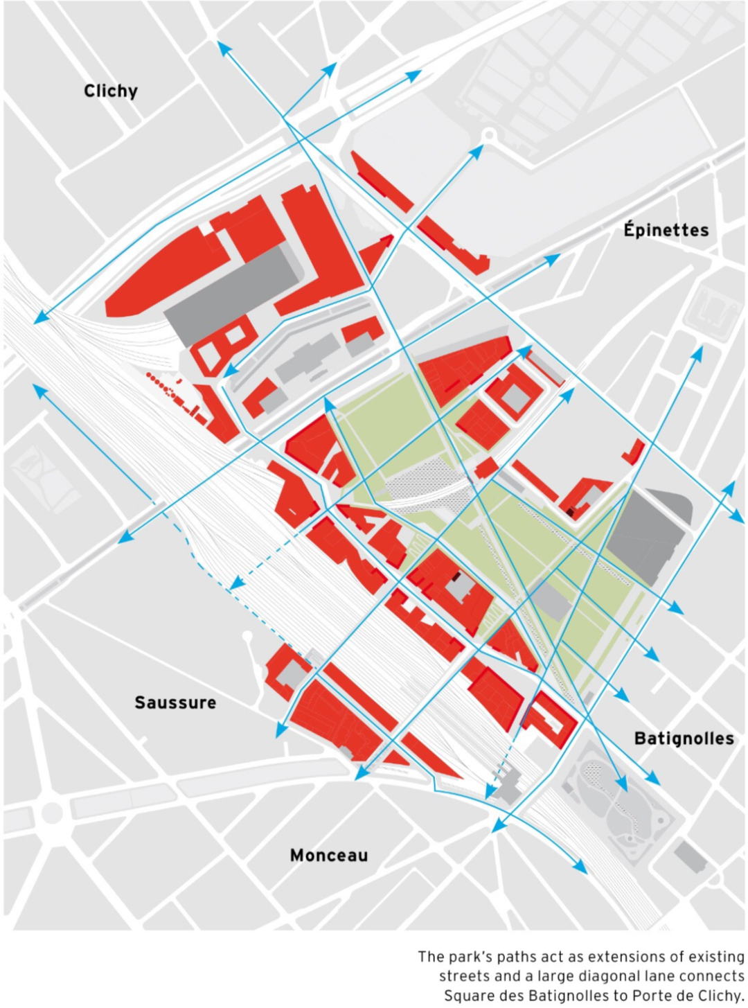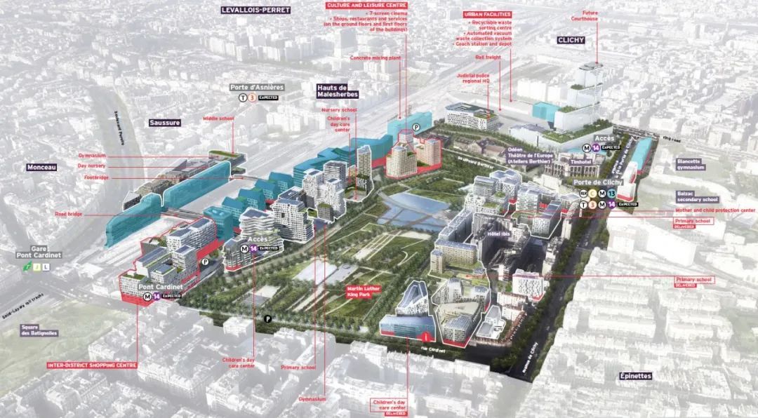 在“大巴黎规划”的背景下,2012年,正式开始了对Clichy-Batignolles的改造和建筑设计,旨在连接巴黎中心商业区、La Défense和Plaine Saint-Denis之间的三角区,建设一个高度混合的新型生态城市中心,作为绿色新巴黎的试点区域。