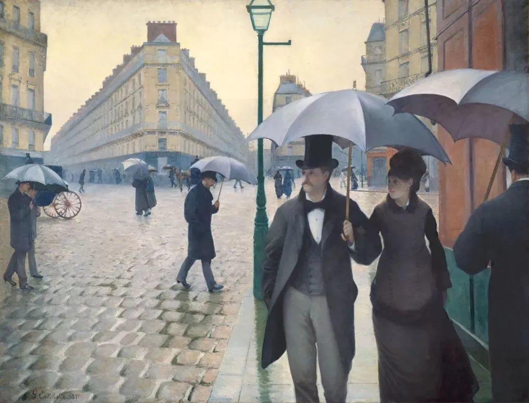 图:Gustave Caillebotte的《巴黎街,雨季》(1877年),芝加哥美术馆