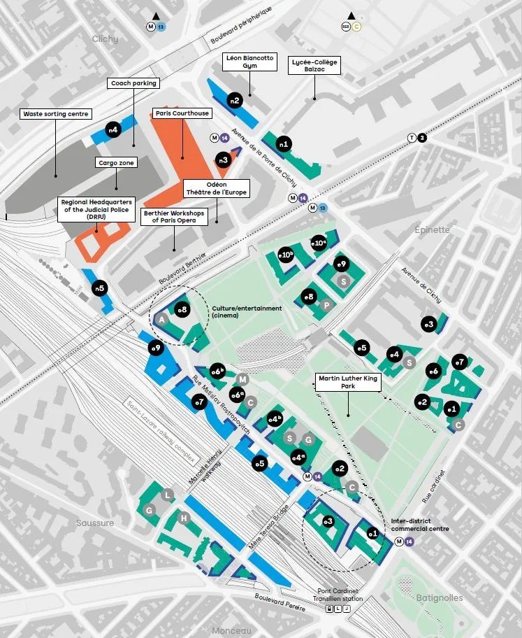 Clichy-Batignolles项目总占地面积为54公顷,涉及到Batignolles铁路枢纽及其附属用地的改造,包括27个地块、一个占地10公顷的马丁·路德·金公园和新巴黎法院。