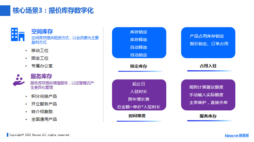 第三个场景是客户报价。在给客户报价方面,一方面客户很关心价格本身,另一方面是在招商的业务环节,会出现后端空间空闲情况跟前端需求情况之间的匹配矛盾。这个矛盾点往往来自于动态的业务过程,同样一片区域,同样一个楼宇里的办公区域,不同的销售都可能会带看客户,在这个时候怎样规避前端给客户做的一些承诺偏差,让后端的可租赁空间运营能够更加的贴合前端实际的业务,与后端的空间管理平台息息相关,同时要赋能前端,使业务团队自己能够更好地锁定库存,基于业务情况做释放。