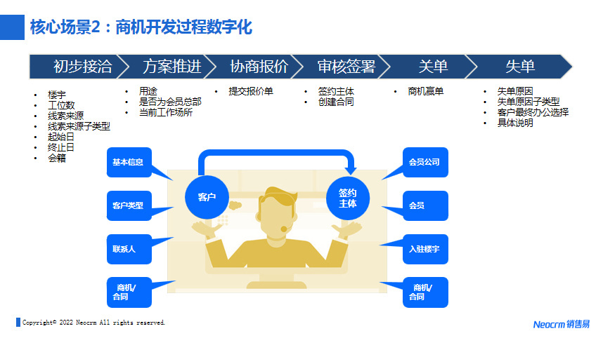 第二个场景是促成交易。促成一笔交易的过程,也是机会的过程管理,核心在于联合办公企业需要构建一个体系化的销售方法论,让企业不同区域里的业务团队能够更好地统一执行业务流程中的关键点。