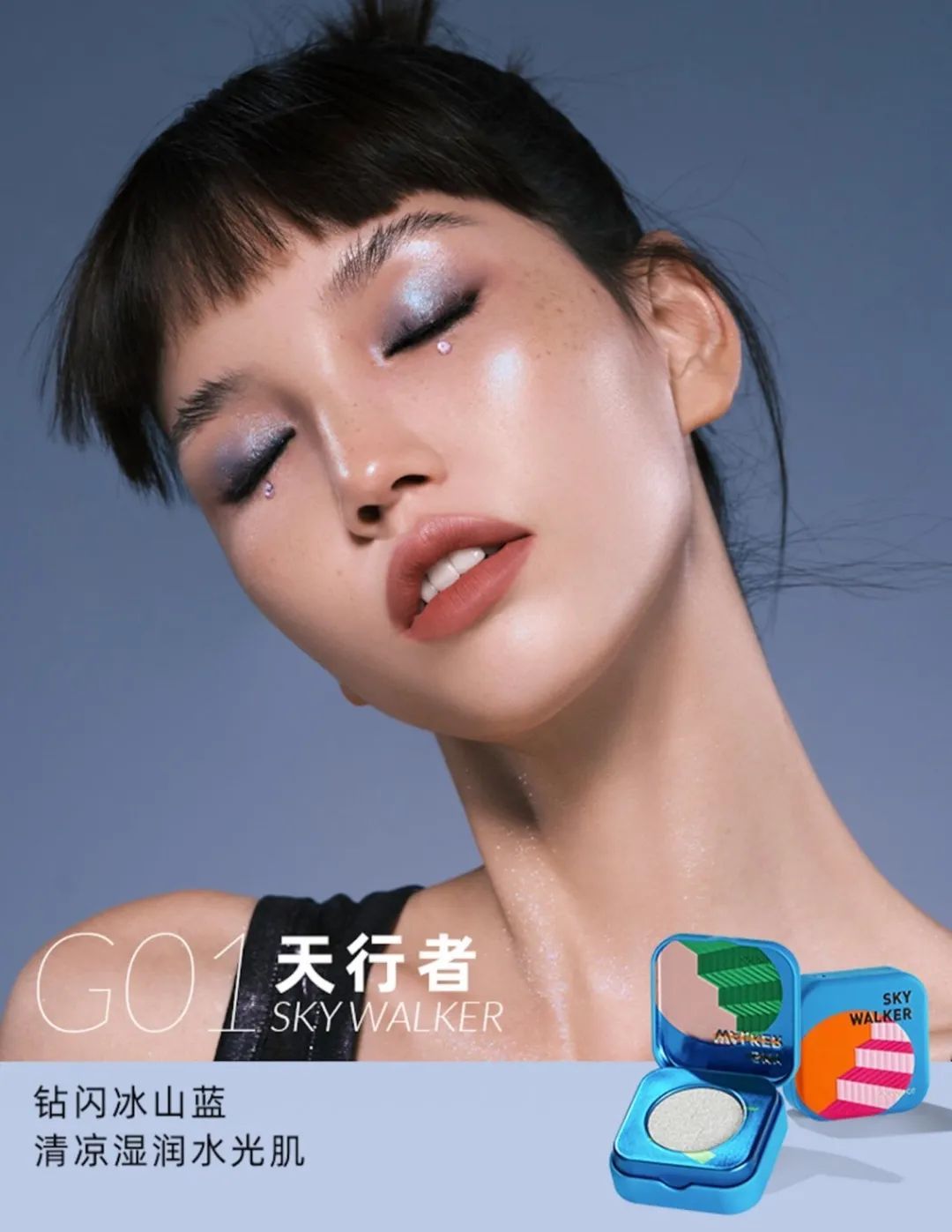 从使用原理来看,腮蓝可以理解为一种色调偏蓝的高光产品,在专门的颊彩产品中,Suqqu在2019年推出的限量款腮红红冰柱就采用了红色和浅蓝色的配色。将范围扩大到面部彩妆产品,浅蓝色的应用也并不少见,可以搭配在提亮肤色的散粉中,比如Givenchy四宫格散粉1号色,也可以用于打造梦幻效果的高光中,比如万花镜新太空时代高光天行者,Make Up For Ever和Nyx等品牌也都推出了浅蓝色的肤色修正产品。