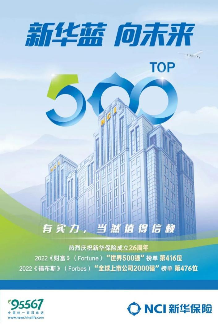 8月3日,2022年《财富》(Fortune)世界500强排行榜正式发布。新华保险以344.76亿美元营业收入成功入榜。这是新华保险继今年5月入围《福布斯》(Forbes)“全球上市公司2000强”榜单前500强后又获认同,再度成为“双世界500强”企业。
