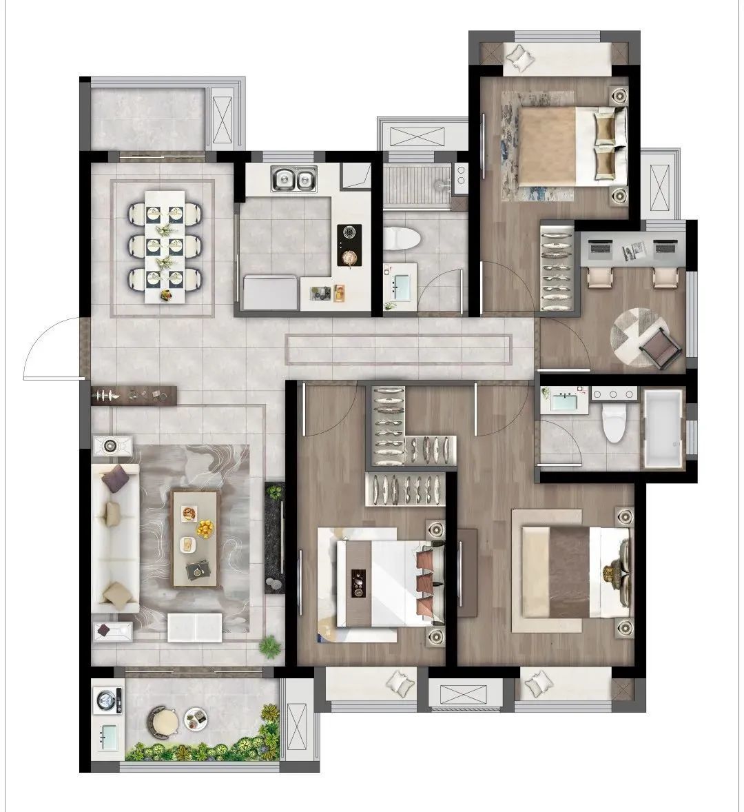 此外,在悦澜天地建筑面积约135㎡户型中,设计师将双阳台、南北通透、全明格局等设计融入人居标准,解决业主曾经的居住烦恼,给予品质感与舒适度。