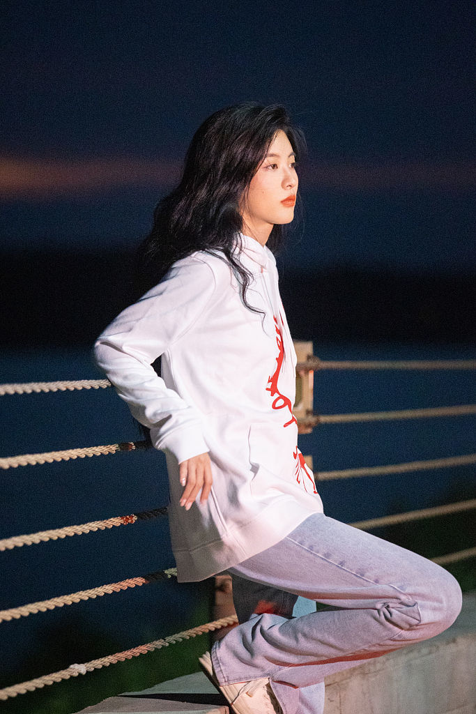 2022年8月2日,孙芮夜景随拍,倚栏杆抬眸远眺。