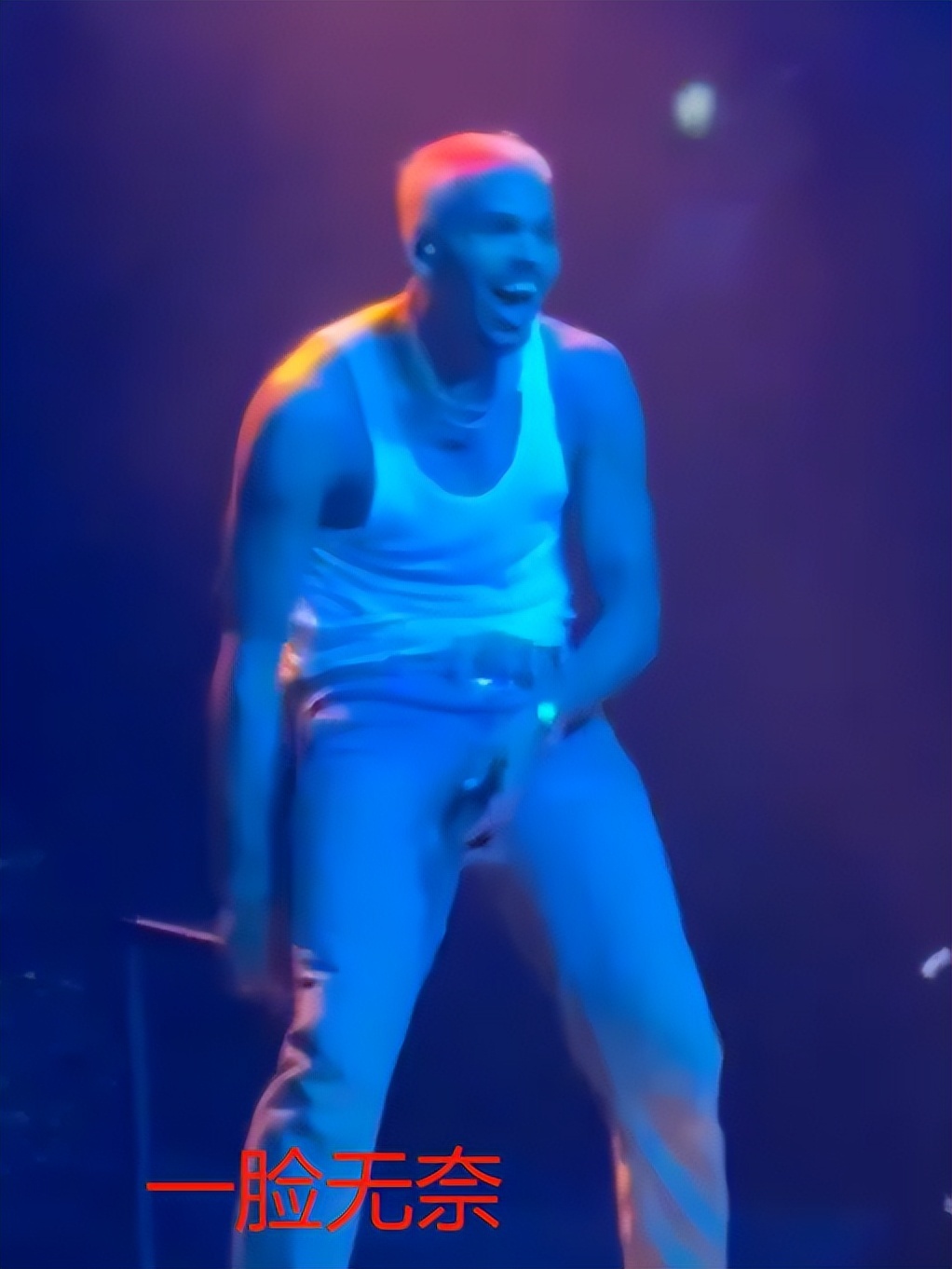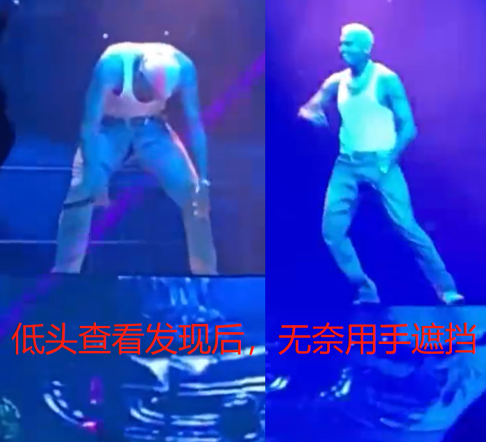 因为一个下蹲的舞蹈动作,克里斯的裤裆直接开裂,他本人当时都觉得有些不可思议,频频低头查看,发现裤子裆部裂开了一个大口子之后,克里斯只能一边忍住笑意,一边用手遮挡,别扭尴尬的动作显得喜剧感十足。