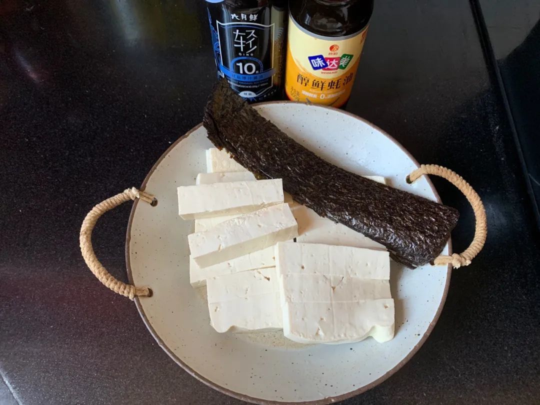 1. 准备好所有食材,豆腐切小块,海苔剪成长条。