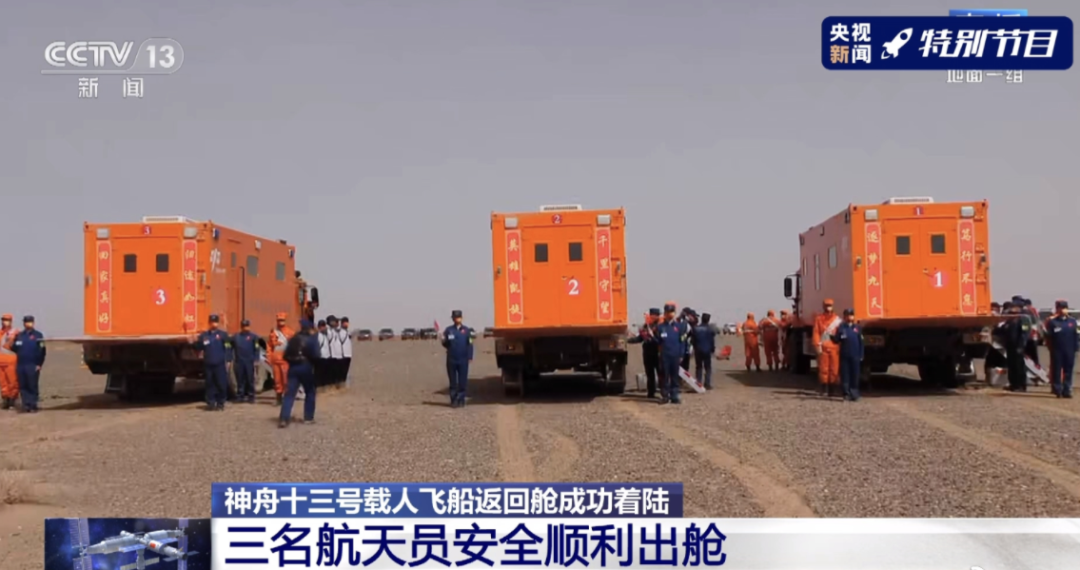 而地面分队人员在戈壁滩上整装待发,地面车辆一字排开。其中最醒目的是三台橙色的医保车,里面有全套的医疗救护设施,像除颤仪、呼吸机等,另外还有一些基本的生活设施,像卫生间、热水、微波炉等。这三台车是接航天员离开戈壁滩的最后一站。