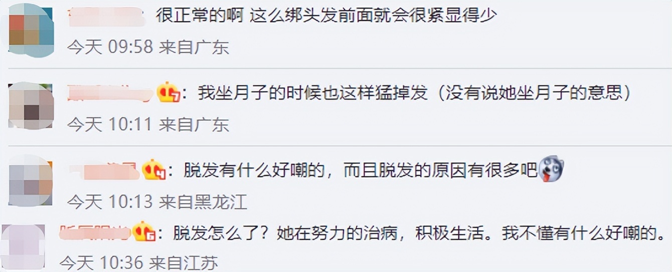 虽然马思纯私下状态显差,但是还是有不少网友为马思纯仗义执言,直称马思纯发际线上移是因为绑了丸子头,所以前面会显得很紧,并且表示马思纯现在在积极治病,就算脱发也可以理解。不过还有网友出来表示自己坐月子也猛掉头发,引发猜测。