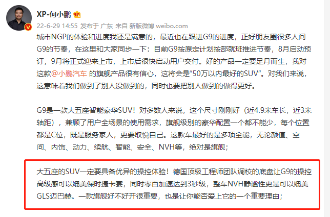 从何小鹏在社交平台上表示,小鹏G9的操控体验也很优秀,零百加速达3秒级,操控体验感比肩保时捷卡宴,整车NVH静谧性媲美GLS迈巴赫。