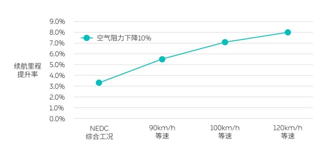 假设一台续航700km的纯电动三厢轿车,风阻下降10%,在其他配置和成本无任何变化的情况下,这台车的NEDC综合工况续航里程可以提升约3%左右。在高速等速工况下(120kph),续航里程提升更是高达约8%,降低电耗更是显著。