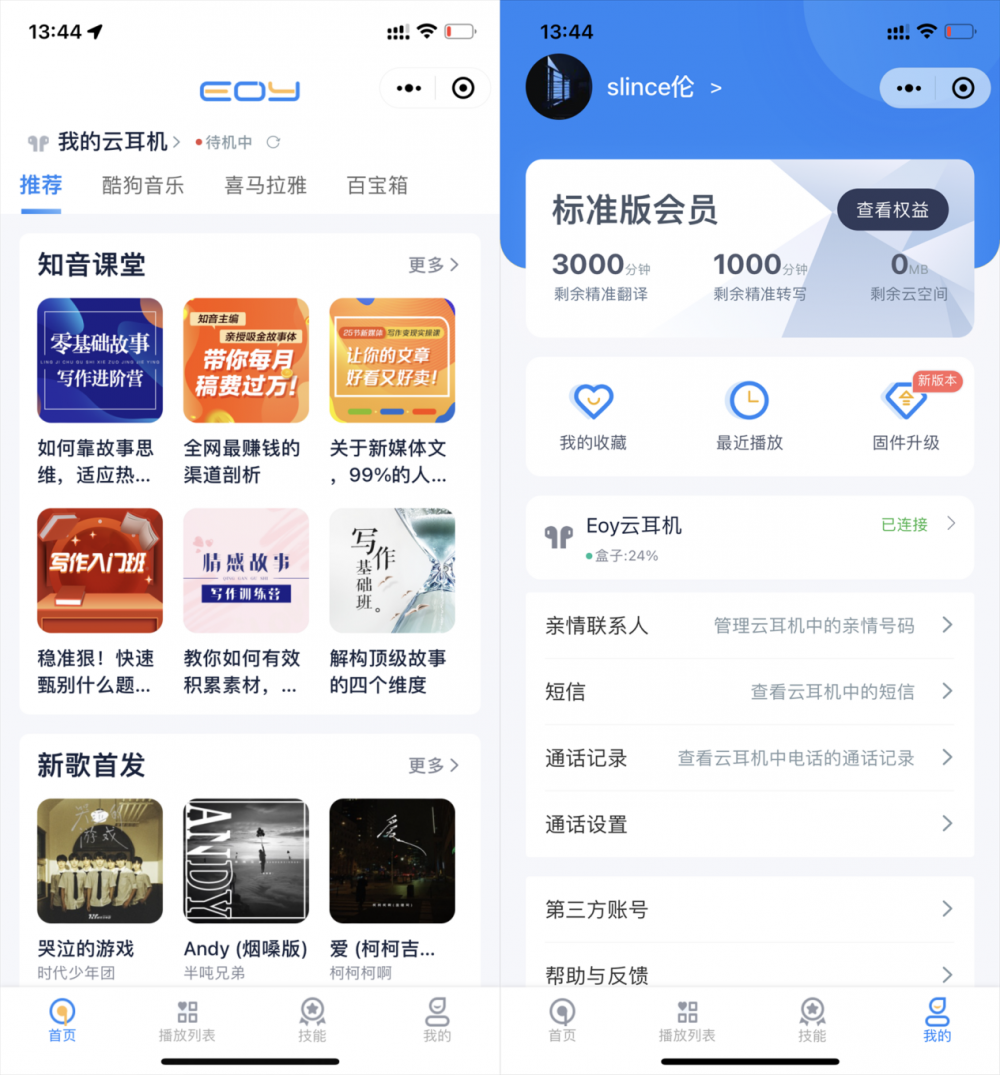 连接小程序后,可以方便用户在电脑和手机上管理个人资料,而且不用单独的下载APP这点好评,进入界面后,云耳机的状态功能一目了然了,什么连接状态、电池电量、内容资源、播放列表、专业技能这些都清楚展示。