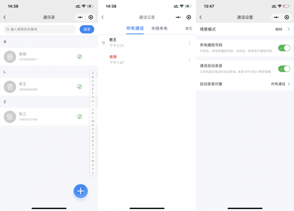 此外,还可以查看云耳机中的短信、通话记录,并可以进行通话设置,其中不仅可以调整响铃/振动,开启电话号语音播报,制定电话自动录音等功能,在通话功能上进一步补全。