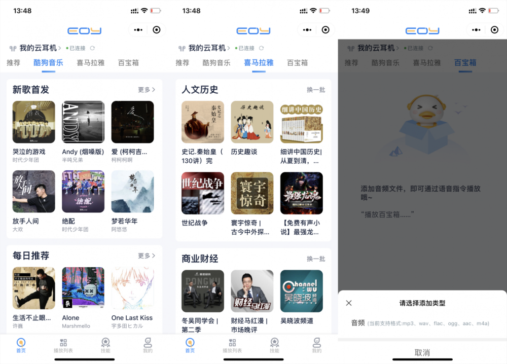 EOY T20里面的内容资源丰富,集合和酷狗和喜马拉雅,内置6000多万收歌曲,以及海量的听课/听书资源,听歌,听课,点播歌曲和喜马拉雅iot的音频内容都十分方便,还支持用户上传自己的音频到云耳机的云空间,进行点播。