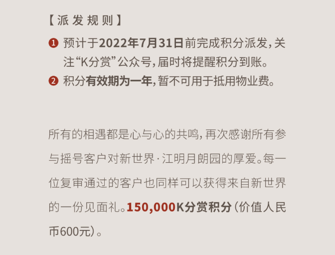 除601位成功选房的业主家人外,K11还大手笔地向每一户参与江明月朗园摇号登记且登记成功的家庭,奉上新世界集团与周大福合资「K分赏」大会员计划的15万积分(250积分抵1元人民币,约600元)。