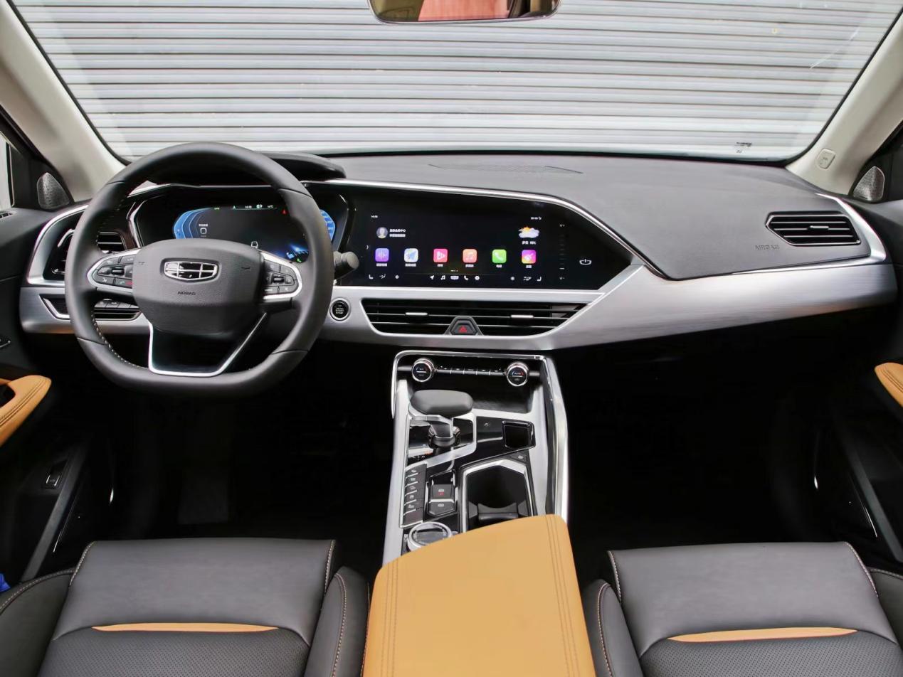 入门版车型配置也不差,配备了全LED自动大灯、全景影像、全景天窗、无匙进入、一键启动、12.3英寸全液晶仪表盘、仿皮座椅、4G网络GKUI吉客智能生态系统、双温区自动空调、后排出风口等等。