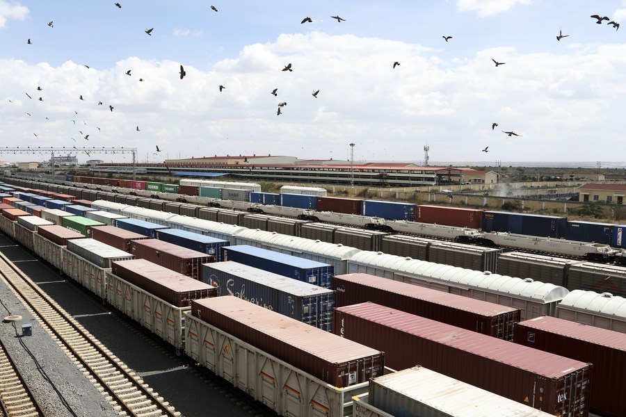 2019年12月17日,首列内罗毕-马拉巴标轨铁路(内马铁路)货运列车驶入肯尼亚奈瓦沙内陆集装箱港。内马铁路项目是蒙内铁路向肯尼亚西北部的延伸。