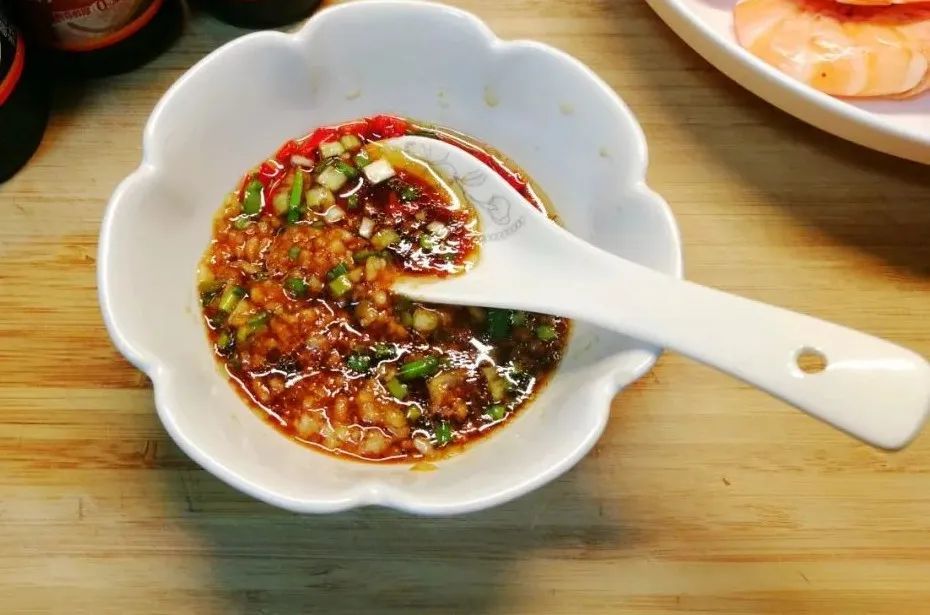 4. 准备蘸料:把葱姜蒜末和小米椒放入容器中,加2勺生抽,1勺蚝油,1勺蒸鱼酱油(豆豉酱油也可以)1勺米醋,2克白糖,1小勺芝麻香油搅拌均匀,锅烧热加10毫升植物油烧热后倒入蘸料碗中即可。