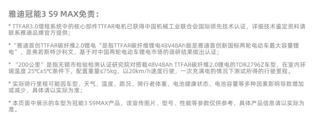 冠能3 S9 MAX之所以拥有如此惊人的续航能力,得益于雅迪首创的TTFAR 碳纤维2.0锂电,容量较普通锂电池提升了一倍,在新国标的规定容量范围内直接拉满。
