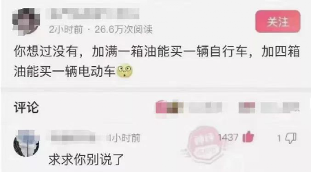还有人算了一笔账,一箱油能买一辆自行车,加满四箱油都能直接换一辆电动车了。