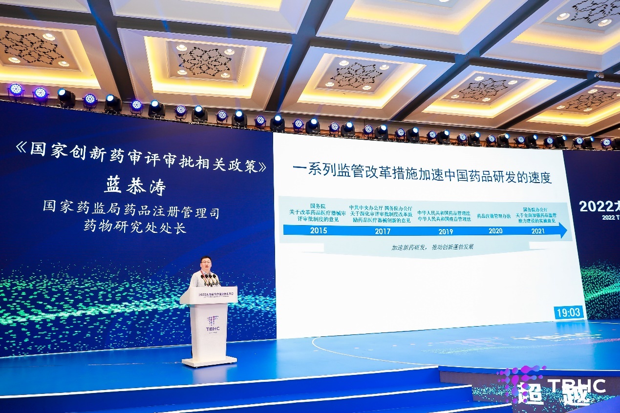 在主旨报告环节,国家药监局药品注册管理司药物研究处蓝恭涛处长,解读了国家创新药审评审批相关政策。