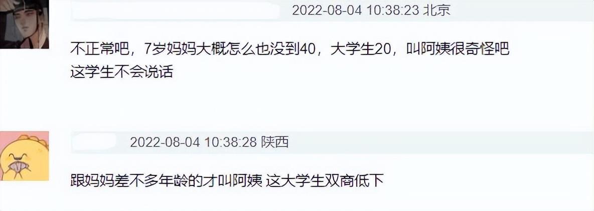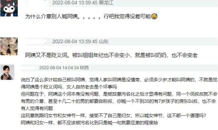 实际上“阿姨”并不是贬义词啊,只是一个很正常的称呼而已,本就不应该被污名化,更不应该只要被喊一句阿姨就要“破防”,有位网友的回复很有道理,被叫阿姨不会变老,被叫姐姐也不会年轻,就算被叫奶奶,也不会立马80岁。