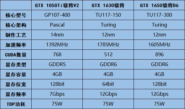 详细配置方面,GTX 1630骁将与GTX 1650 骁将D6均采用图灵架构,而GTX 1050Ti骁将V2则采用帕斯卡架构。1050Ti骁将V2采用的是GP107-400核心,1630骁将采用的是TU117-150核心,1650骁将D6采用的是TU117-300核心。另外,1050Ti骁将V2的显存类型为GDDR5,两款16系显卡的显存类型则为GDDR6。