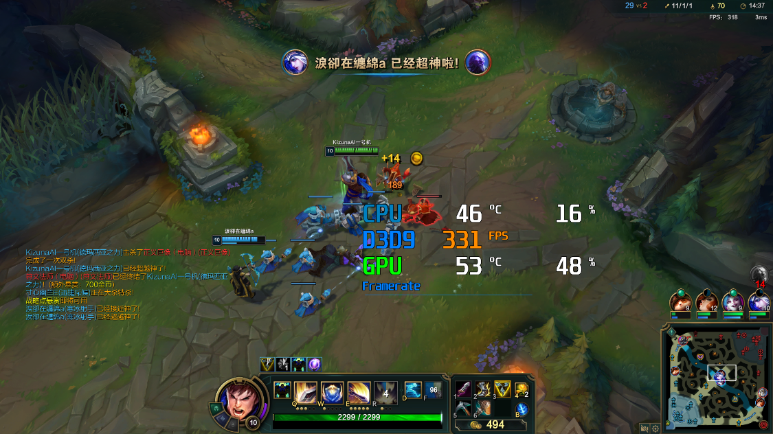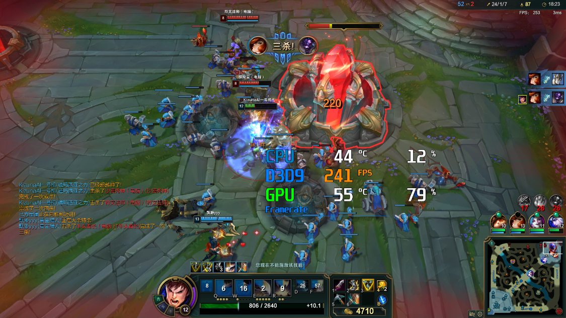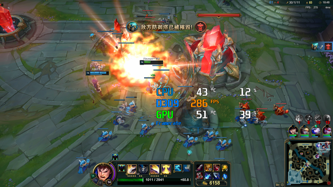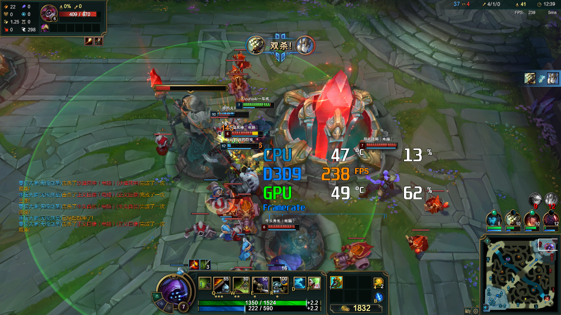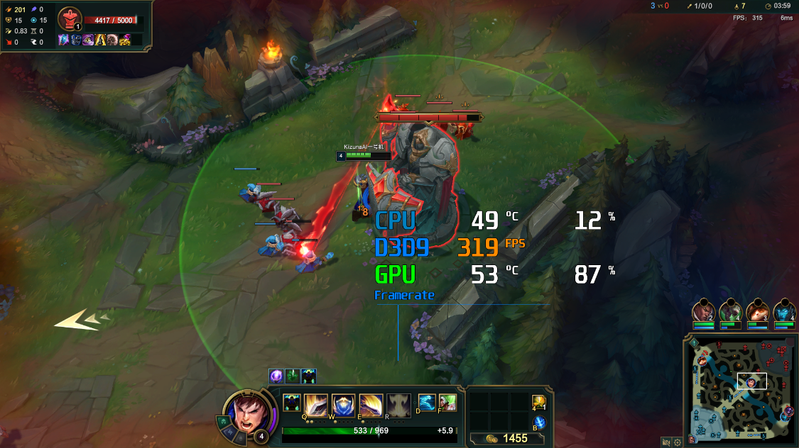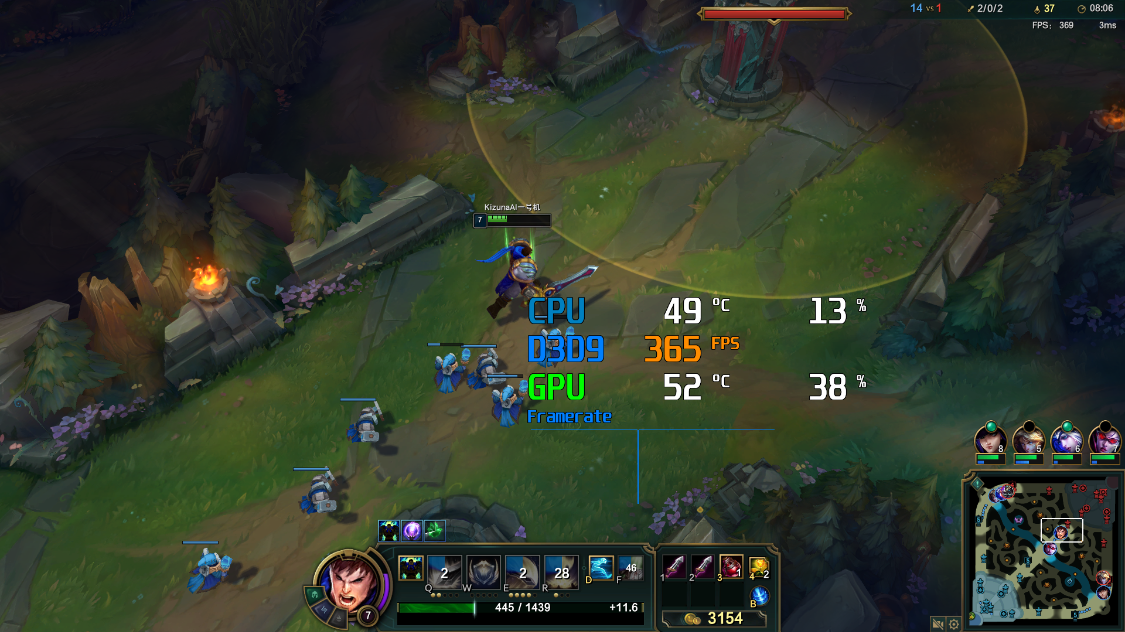 在《英雄联盟》游戏中,人机模式,将画质设为极高,使用微星小飞机进行帧率监测。在游戏的推塔阶段时,1050Ti 骁将V2的实际游戏帧率可以维持在330FPS左右,1630 骁将基本维持在310FPS左右,1650 骁将D6可以维持在360FPS。在游戏进行至团战阶段时,1050Ti 骁将 V2的实际游戏帧率可以达到240FPS左右,1630 骁将的游戏帧率可以达到230FPS左右,1650 骁将D6的帧率可以达到280FPS左右;