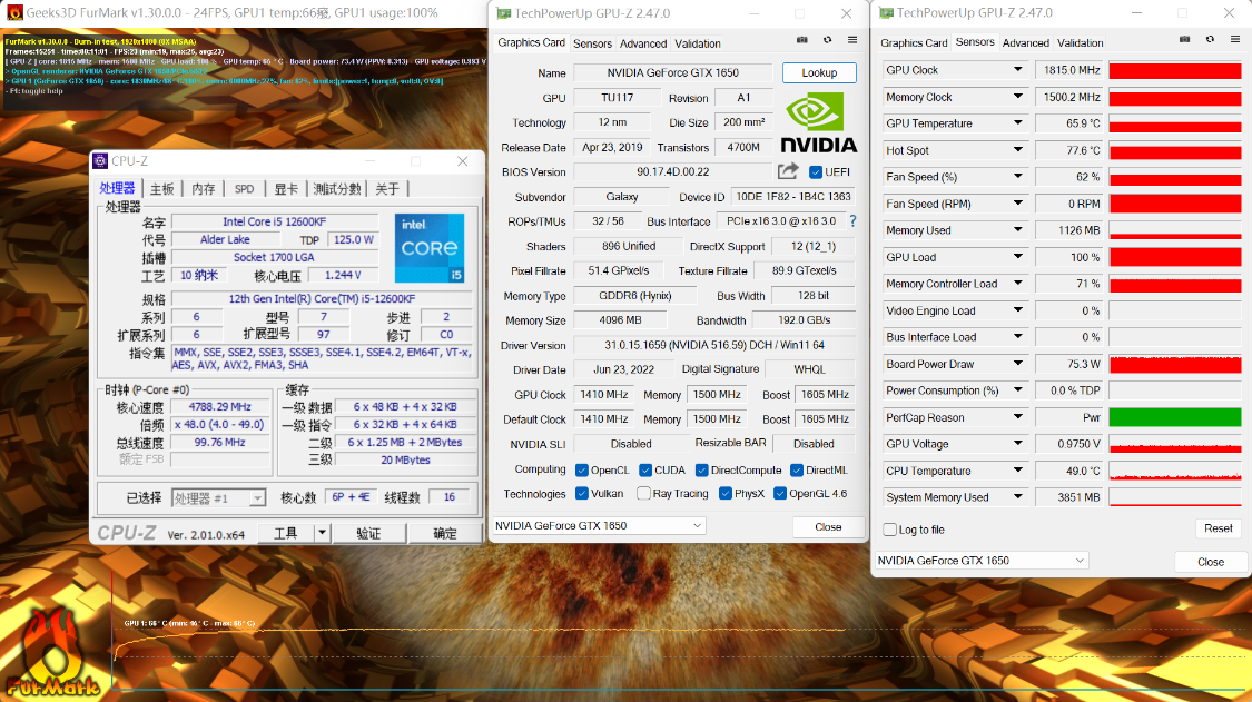 FurMark 显卡烤机测试,三张显卡的温度最高也就60多度,功耗也都维持在75W左右;